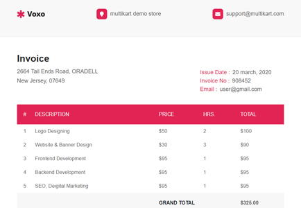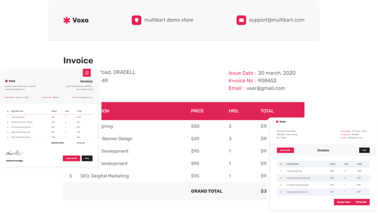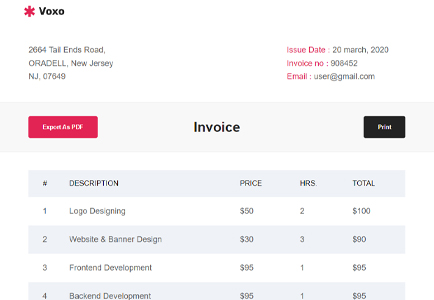 Invoicing templates are quick and simple. They are easy to interact with, fill out, customize, and save. Voxo comes with a clean and modern invoice with Export as PDF and Print option. Voxo has 3 Invoice templates.