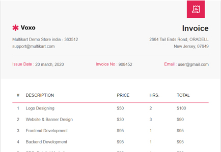 Invoicing templates are quick and simple. They are easy to interact with, fill out, customize, and save. Voxo comes with a clean and modern invoice with Export as PDF and Print option. Voxo has 3 Invoice templates.